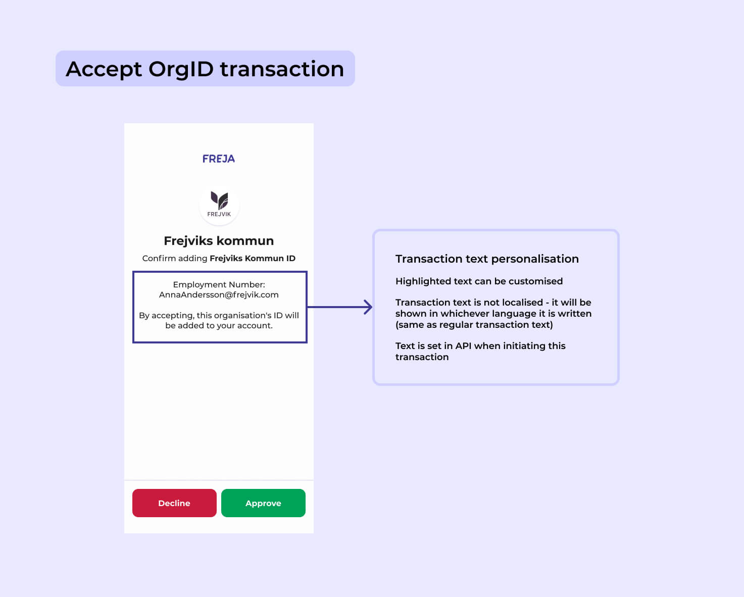 När ni onboardar era användare för att utfärda ett OrgID till dem kommer ni nu att kunna anpassa texten i den transaktionsskärm som användaren måste acceptera för att gå vidare. Detta ger er större flexibilitet att kommunicera kring registreringsförfarandet.