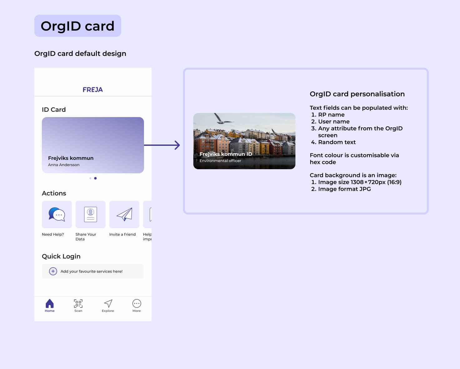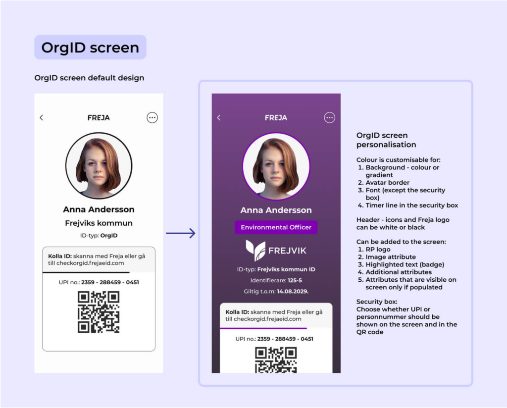 Har ni ännu inte utnyttjat möjligheten att specialdesigna ert OrgID är nu ett bra tillfälle med alla de nya möjligheter som ges. En specialdesign kopplar OrgID tydligare till er organisation och framhäver de värden som ni har i er grafiska profil, så att användarna bättre känner igen sig och därmed förknippar OrgID starkare med er som utfärdare. Hör av er till sales@frejaeid.se så får ni hjälp att komma igång.