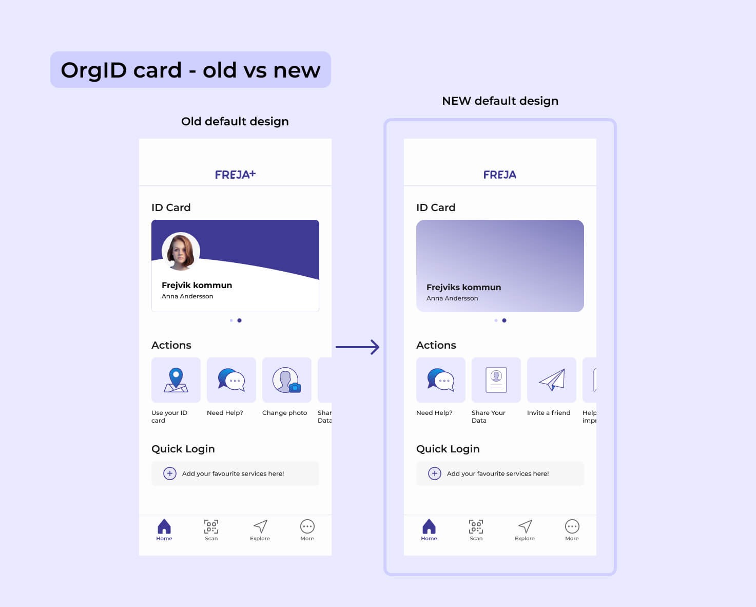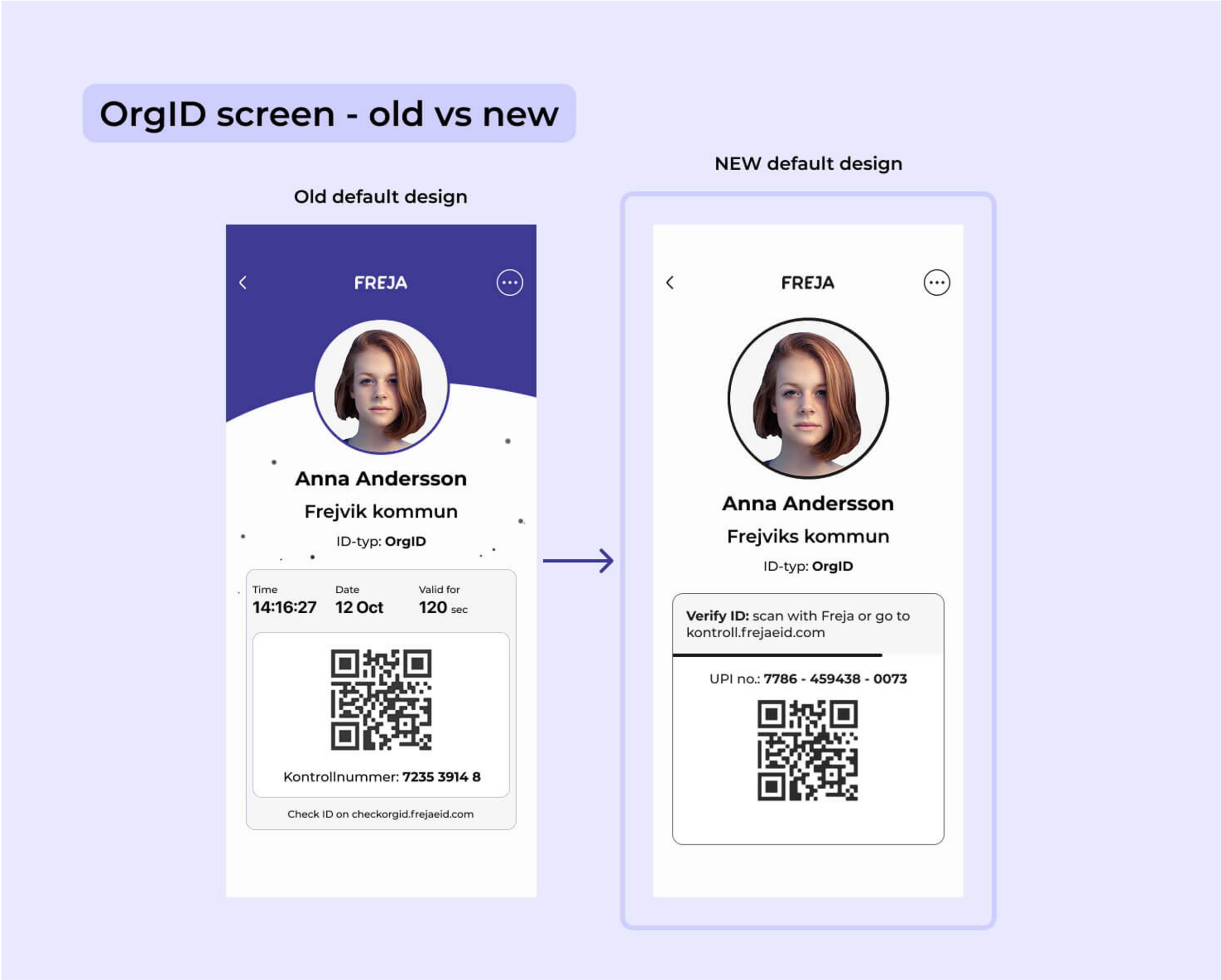 Har din organisation gett ut Freja OrgID med standarddesign är det viktigt att ni snarast informerar era användare om att ID-kortet och ID-skärmen i deras OrgID kommer att få ett nytt utseende. Detta för att användarna ska förstå att förändringar är planerade och därmed minska administration för frågor som annars kan uppkomma. Förändringen sker kring månadsskiftet februari/mars 2026. Följande förändringar kommer att ske för era användare (se även bilder nedan):